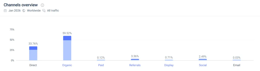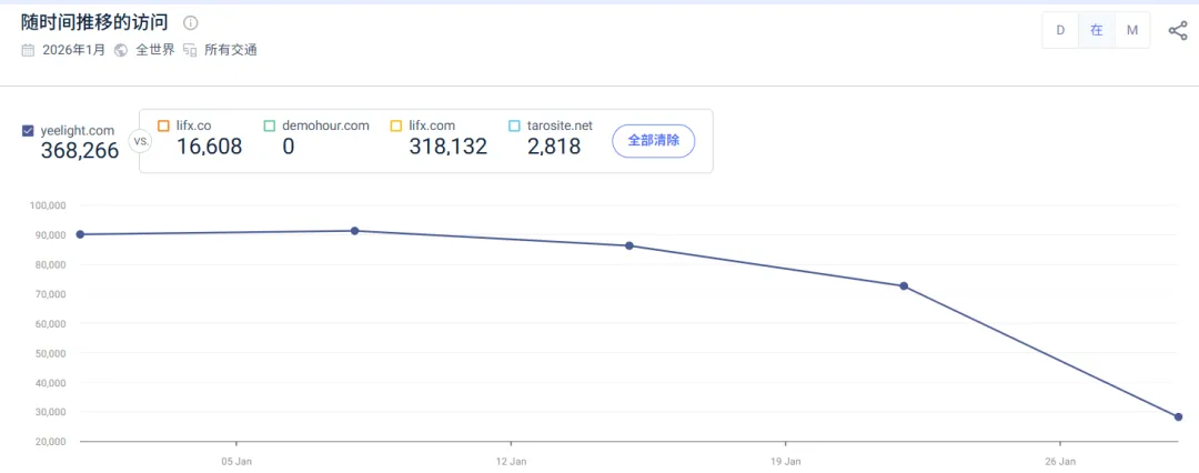 线上,Yeelight 深耕独立站,SimilarWeb 数据显示,2026 年 1 月独立站月访问量超 36.8 万次,其中,直接流量占比达 33.76%,有机流量占比达 59.52%。