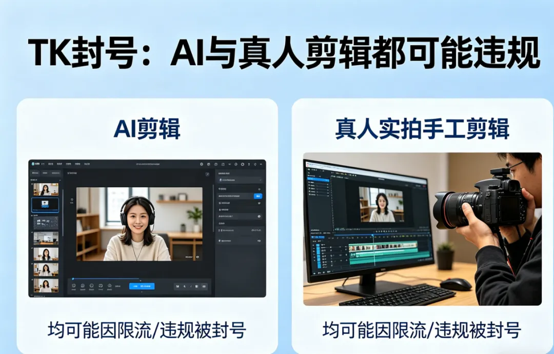 这不是AI工具的问题,也不是提示词的问题,而是整个TikTok电商圈的通病。哪怕你全程真人实拍、手工剪辑、无任何工具辅助,照样会遇到限流、违规甚至封号的情况。封号是TK电商的普遍风险,绝非AI生成内容的专属“惩罚”,不用把AI当成背锅侠