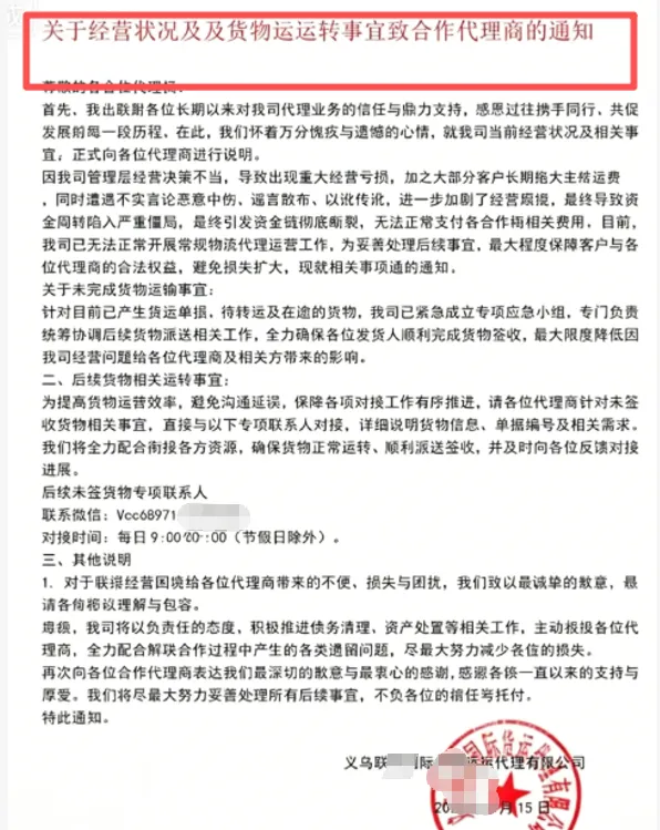 4 月 15 日,义乌跃某国际货运代理有限公司发布一则官方公告《关于经营状况及后期货物运转事宜致合作代理商的通知》;