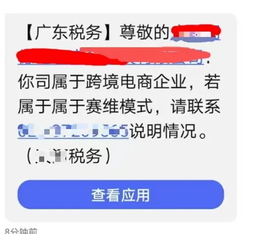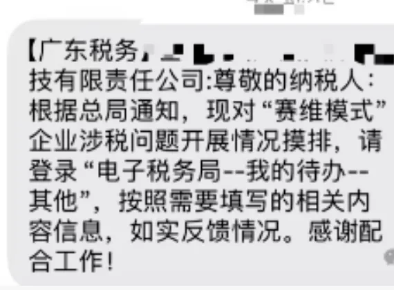 近日,广东广州、中山、东莞等地的跨境电商卖家纷纷在行业群中反馈,陆续收到当地税务局通过短信、电话发出的通知;核心内容是询问企业是否采用 “赛维模式” 运营,并要求主动联系说明情况、填报相关经营资料。