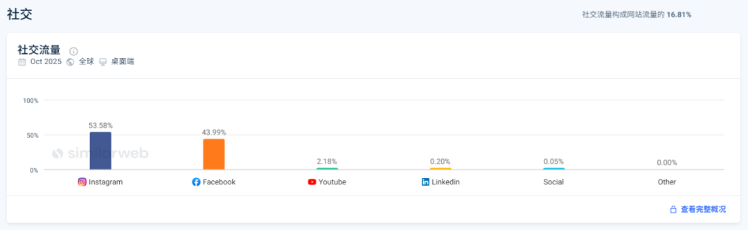 根据 Similarweb 数据,Caddis 官网的流量有 16.81% 来自于社交媒体,其中 Instagram 和 Facebook 是带来最多社媒量的平台。