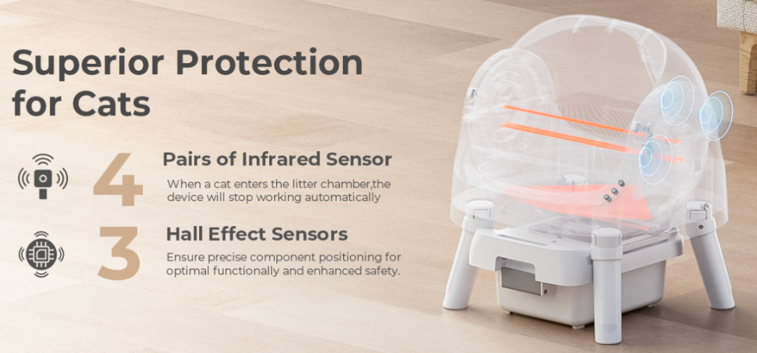 产品在设计上配备四个红外传感器和三个霍尔效应传感器,可主动检测猫咪的存在,最大程度解决传统封闭式猫砂盆容易夹伤猫咪的问题。不仅如此,去掉了复杂的 App 控制和 Wi-Fi 连接,做到“插电即用”,大大降低了用户使用门槛和售后难度。并在结构上优化了噪音与清洁效率。最重要的是,产品售价控制在 200 美金以下,比市面上的高端智能猫砂盆便宜一半以上,让更多人都能负担得起。