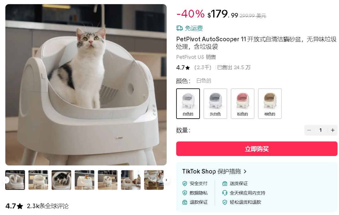 最终,这款在产品结构设计上做了“减法”的智能猫砂盆在 TikTok Shop 上迅速走红。为了匹配产品在 TikTok 上以年轻女性用户为主的群体,她们特意推出了粉色吸睛款猫砂盆,兼顾功能与审美,几乎一上架就被抢空。