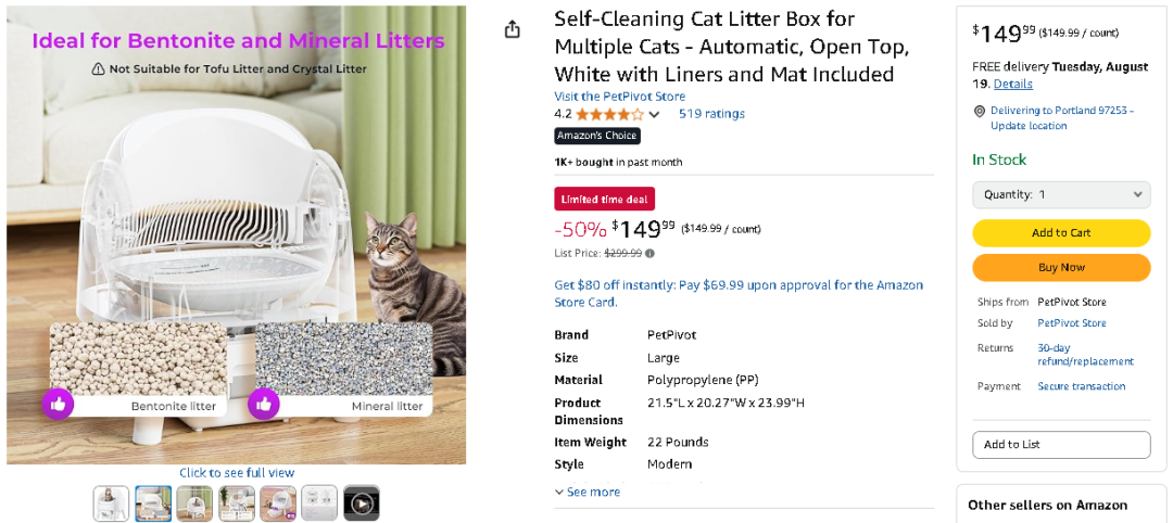 而另一头的合伙人 Lena 在刷 TikTok 视频时也敏锐捕捉到了宠物经济的爆发力,在 #pet 的话题标签下,全都是世界各地的铲屎官们在分享自己毛孩子的日常,这些宠物内容天然自带“高互动、高情绪、高停留”属性,让人情不自禁地点赞、评论、转发,平台上的宠物用品也极易引发用户共鸣和冲动消费。经过市场调研,她们发现美国宠物经济正以惊人的速度增长,美国的自动猫砂盆市场虽有需求,但普遍价格高昂、体验平平,仍是一个尚未被深度挖掘的品类。俩人当机立断决定切入宠物赛道,打造面向全球年轻养宠群体的产品,这个决定也为 PetPivot 故事拉开了序幕。