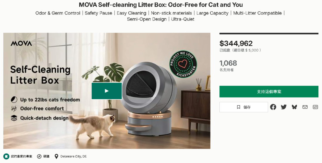 宠物赛道的市场潜力毋庸置疑,尤其是智能猫砂盆这一细分品类,近年来备受资本和消费者的高度关注。无论是前段时间刚在 Kickstarter 众筹平台上以远超原定 5000 美元目标,最终筹得 34 万美金的 MOVA 智能猫砂盆项目,还是国内宠物智能硬件领先品牌小佩宠物(PETKIT)在全球持续热销的宠物智能硬件产品,都充分体现了用户对自动化、便捷式宠物用品的强烈需求。