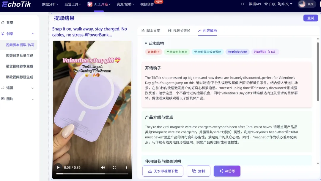 国内爆款开头模板裂变:借鉴抖音/快手成熟开头,换TikTok产品。案例:“Regret not finding it earlier! This little gadget solved my problem for years!”(接无线充电板、数据线收纳器等)。