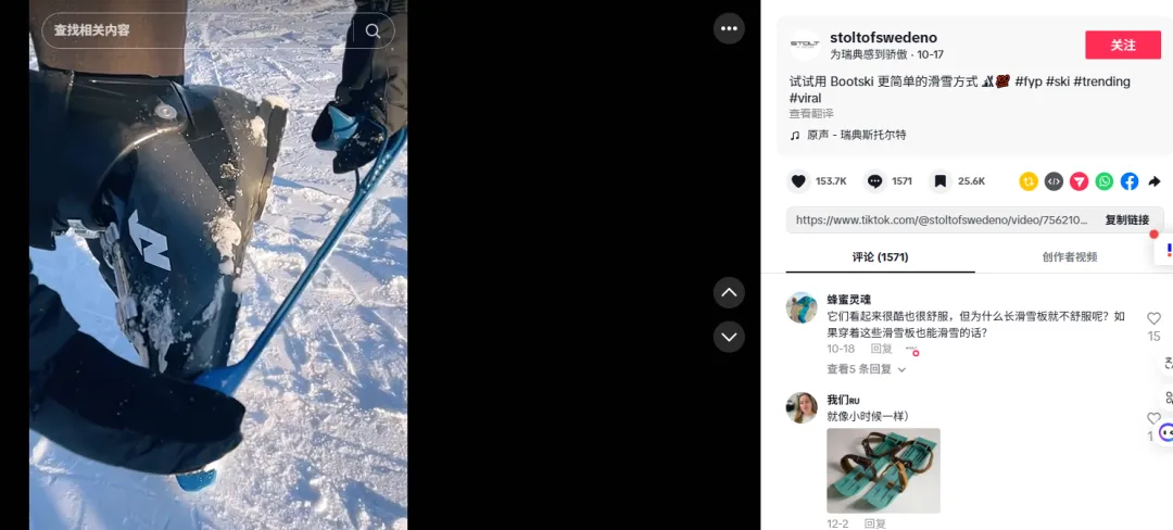 在 TikTok 上,用户不需要花费大量时间解释产品参数或技术细节,只需通过短短十几秒的视频,就能直观呈现“穿上就能滑”“轻松好玩”“不需要复杂准备”的核心价值。相比传统滑雪装备动辄需要教程讲解和专业视角切入,BootSki 的传播门槛显著更低。