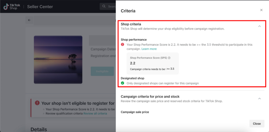 报名活动的时候,大促详情页会显示资格状态。点击 “查看全部标准” 能看到完整要求。