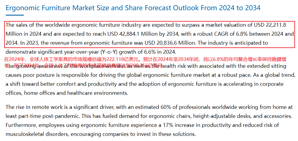 据 futuremarketinsights 数据显示,在 2024 年,全球人体工学家具市场规模的估值为 222.118 亿美元。