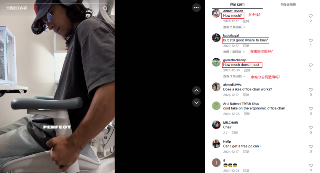 截至目前,这条创意短视频的播放量已达到了 150 万,获赞量为 4.76 万,许多用户都在评论区询问价格及购买方式:“多少钱?”“在哪里买更好?”“家庭办公椅适用吗?”