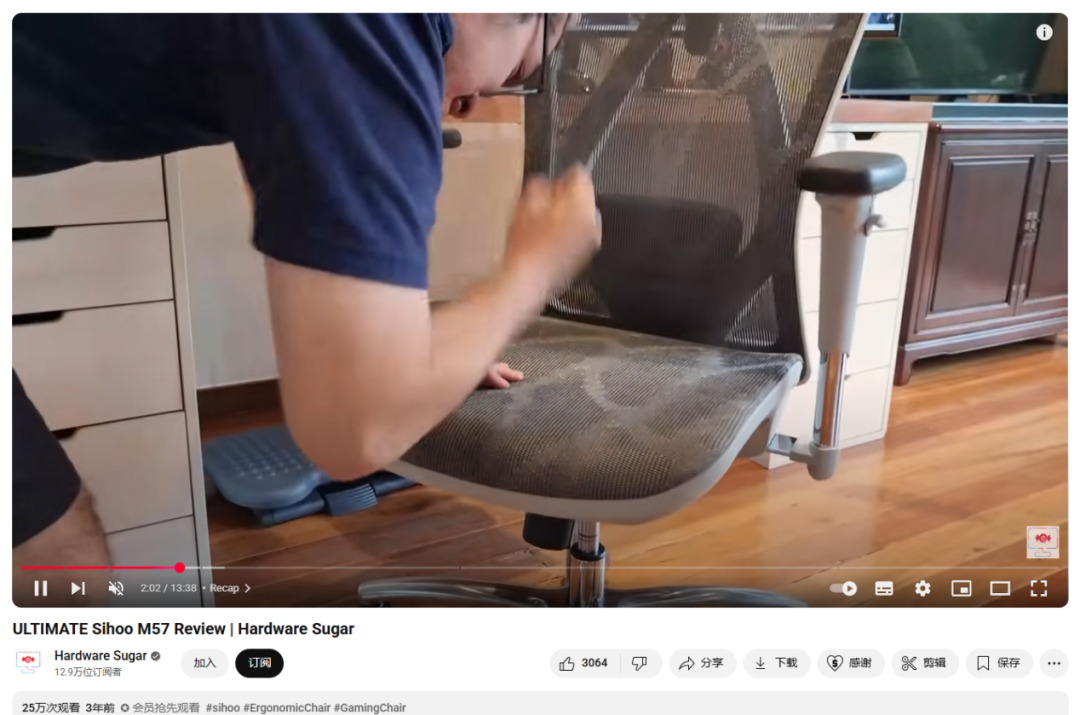 拥有 12.9 万订阅者的科技博主 Hardware Sugar,就是该品牌的合作博主之一,其为 SIHOO M57 这款人体工学座椅拍摄了一条详细的测评视频。截至目前,视频观看量达到 25 万次。