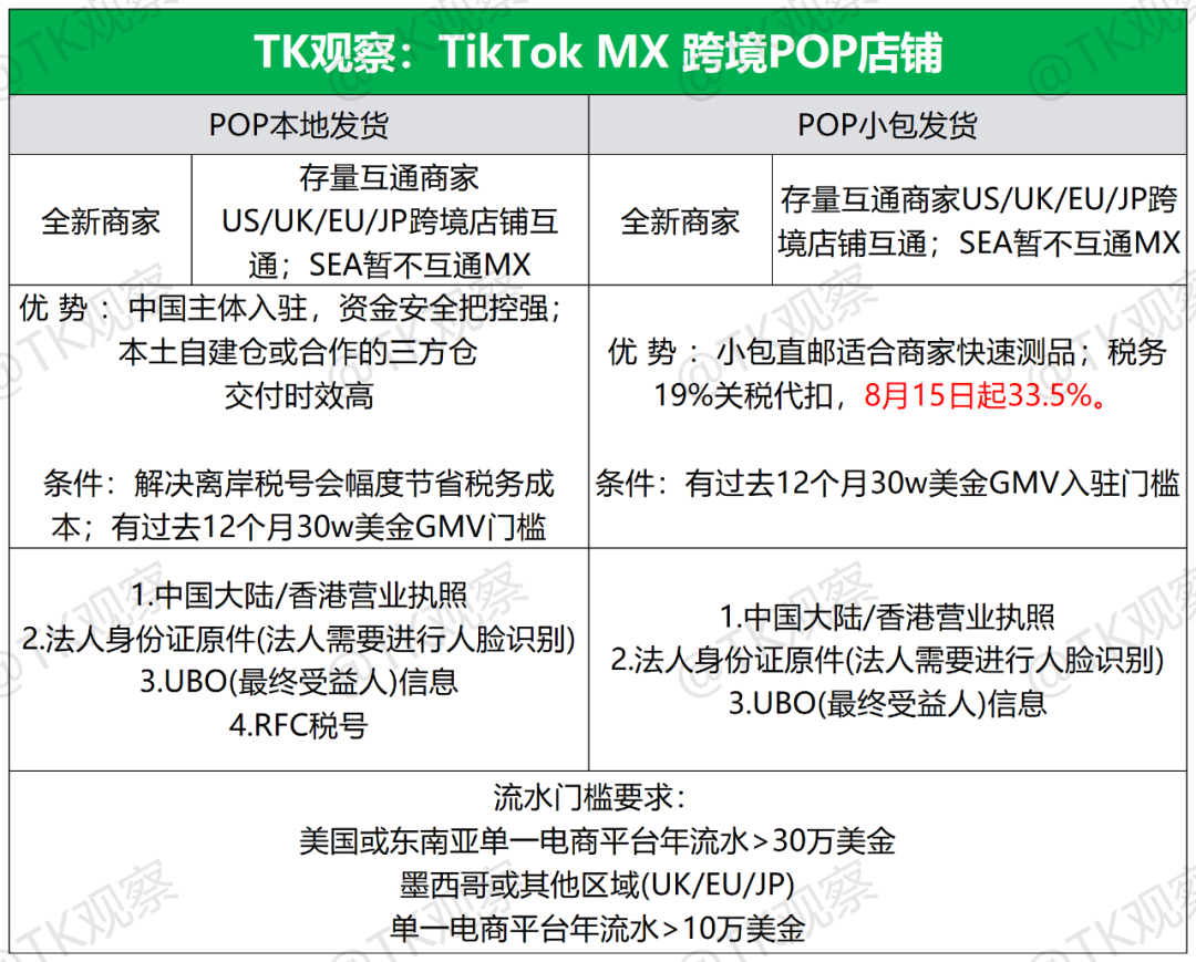 TK观察独家获悉,TikTokShop墨西哥站点POP跨境店模式,将存在“POP本地发货”和“POP小包发货”两种形式,入驻门槛需要满足美国或东南亚单一电商平台年流水大于30w美金或满足UK/EU/JP单一电商平台年流水大于10w美金。支持中国大陆/香港营业执照申请入驻,另外需要法人身份证(需人脸识别)、UBO(最终受益人)信息,POP本地发货模式还需要提供RFC税号。