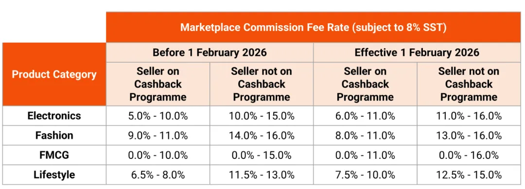 自2026年2月1日起,平台调整返现计划服务费(Shopee Cashback Programme (SCP)),卖家在促销日(包括两位数销售日、月中促销和发薪日促销)期间,需支付 7.5%的服务费(每件商品最高收费 100 令吉)。
