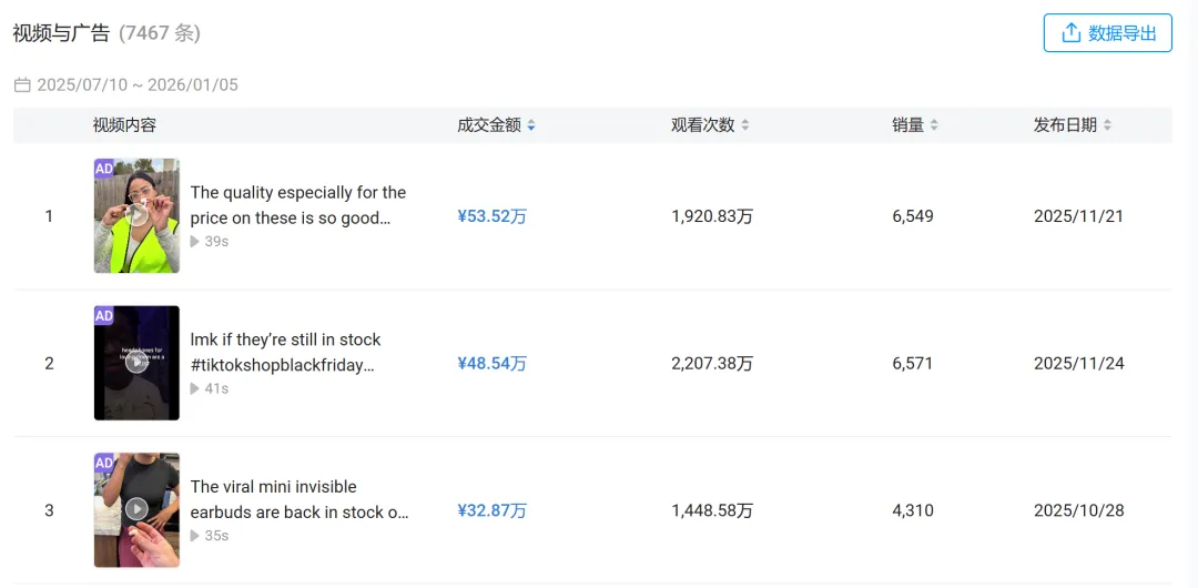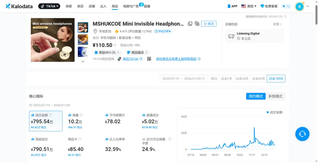 耳机这种品类,早就被音质、降噪、品牌心智反复教育过,新玩家想再挤进去,几乎只能硬碰硬。但在 Kalodata 的数据里,我们却看到一款完全反常的产品——一副主打“隐形”和“睡觉也能戴”的超迷你蓝牙耳机,在 TikTok 美区连续几个月稳定出量,半年成交额接近 800 万人民币。