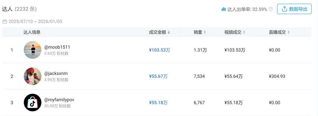 从结果看,这个判断是成立的。过去半年里,这款耳机累计带货视频超过 7000 条,合作达人超过 2200 个,出单率稳定在 30% 以上,直播场次破千,但销量并不是被少数头部达人“顶”出来的,而是靠大量中腰部内容持续铺开。