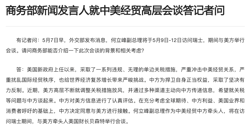 5 月 7 日,商务部新闻发言人就中美经贸高层会谈回复称,在考虑全球期待、中方利益的基础上,中方决定同意与美方进行接触。