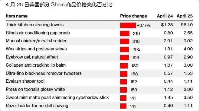 关税政策后,Temu、Shein 也同步公告称因运营成本上升,于 4 月底实施价格调整。根据彭博社的统计,不少商品在调价后涨了一倍多,甚至最高涨幅达到 377%。