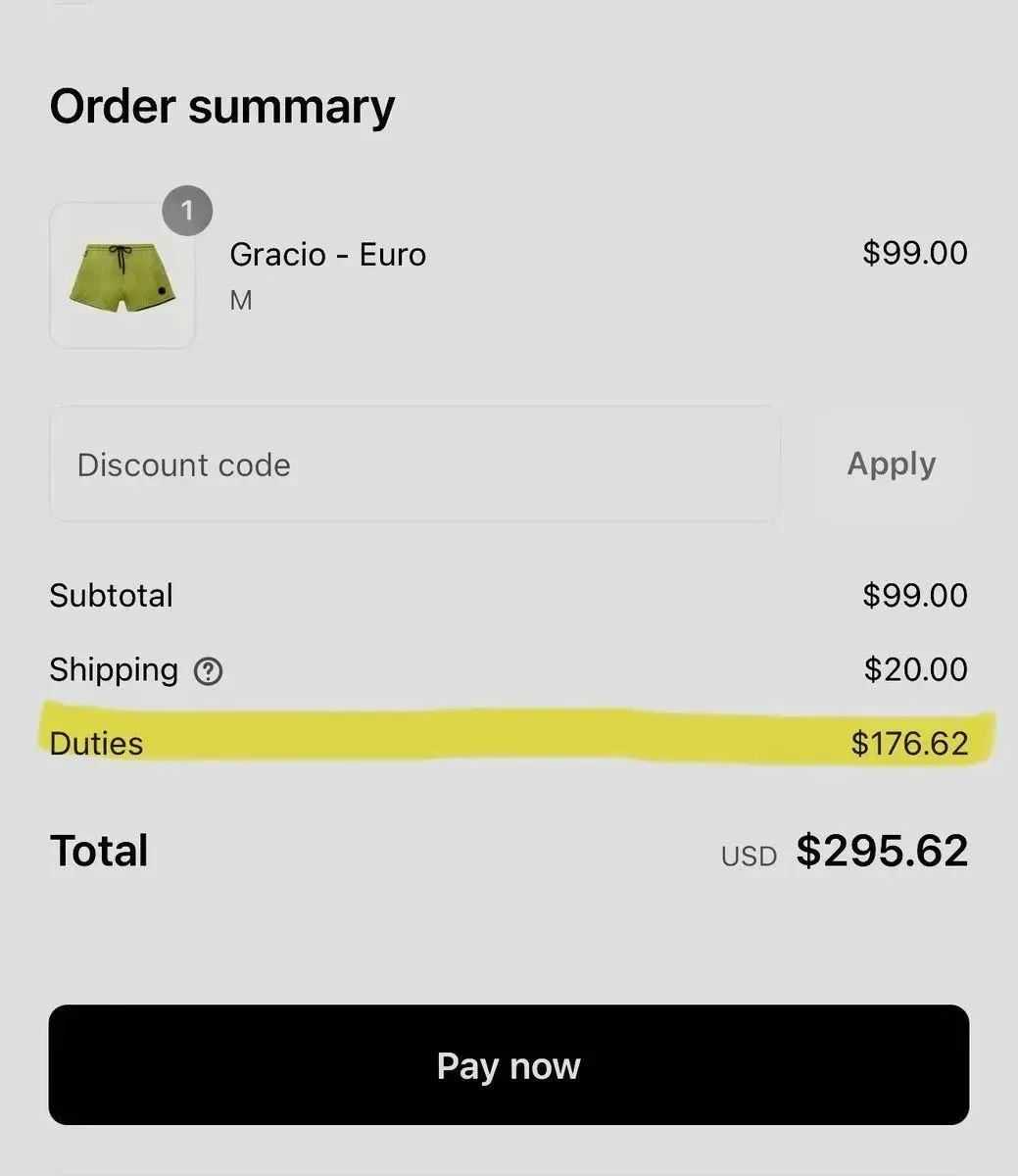 以某品牌短裤为例,原价 99 美元(约合人民币 715 元),而关税成本甚至比短裤价格还要高,接近 176 美元(约合人民币 1272 元),最终一条短裤的售价高达 259 美元(约合人民币 1871 元)。