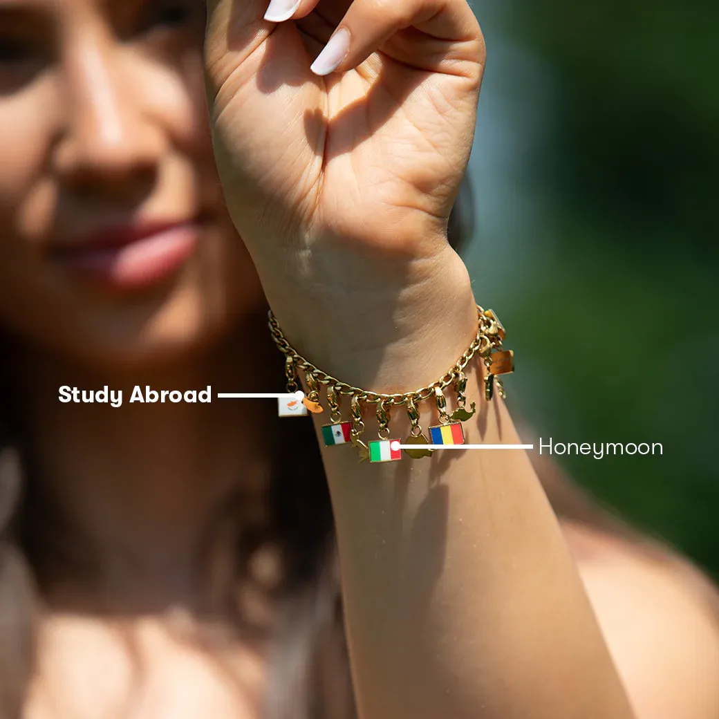 它的产品其实是半定制模式:提供一些简约百搭的手链做基础,再搭配不同国家的国旗和地图形状的小吊坠,供用户自由搭配佩戴。