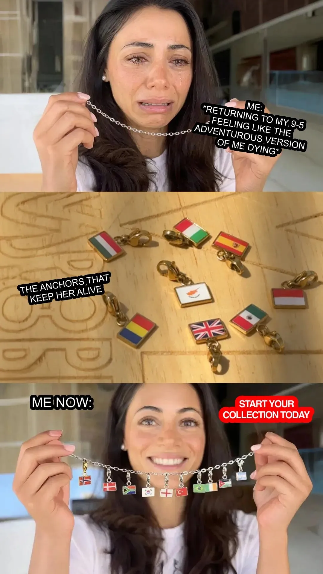 最新投放的素材也很有意思,是一则meme,用年轻化、网络化的方式与受众沟通。三格情绪递进的梗图设计,首格讲旅游后回归朝九晚五的悲伤,让大家瞬间代入;中间格展示国旗吊坠,配文把吊坠定义为精神锚点,提供治愈效果,用产品承接情绪;最后一格用满面笑容具象化了手链的情绪价值,再加上行动号召,把情绪共鸣转化为购买动力,让人会心一笑。笔者看完都想去买一条了。