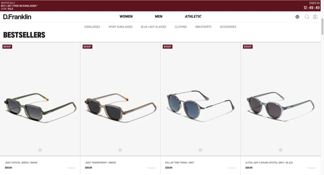 D.Franklin独立站热销榜上的产品主要是墨镜,价位在$60-70区间。目前都在做买一送一的促销活动,页面顶部还悬挂着实时变动的活动结束倒计时。