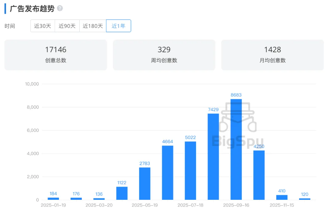 令人意外的是,尽管Exchange life近一年投的视频类素材是图片类的2倍多,但其热投的素材却是一系列的图片;从2025年9月中旬开始投放,在17周的时间内获得了240万+的展示估值;而且还是最简单的纯白底商品图,比如下面这张多枚国旗图案吊坠的手链。