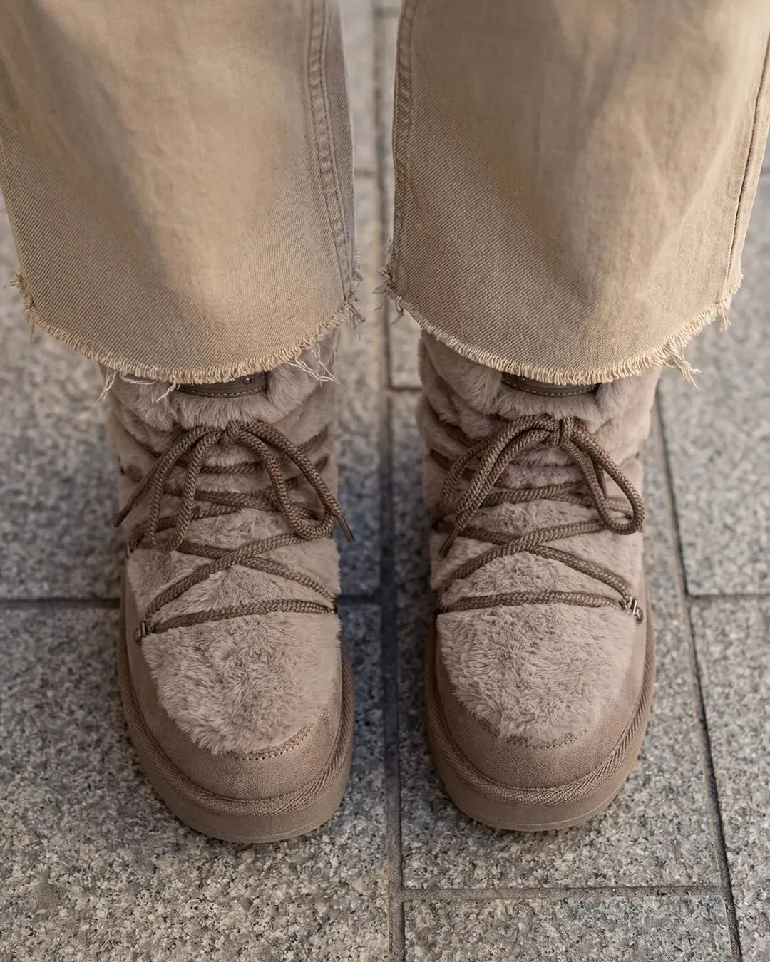 最新素材是发布于2025年12月中旬的一则冬靴图片,用的是一张贴近日常穿搭场景的冬靴实拍图。背景石砖地面可以看得出来是在户外环境。画面聚焦双脚,展示了卡其色的毛绒靴搭配同色系毛边牛仔裤,传递出休闲随性的风格,让用户能直接代入自己的日常造型。