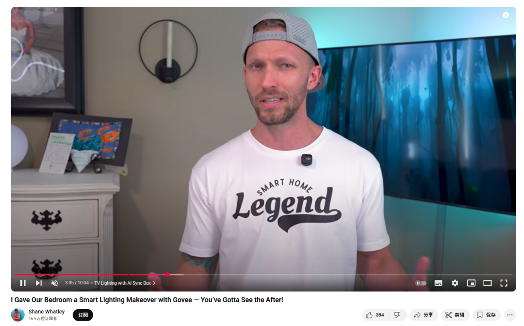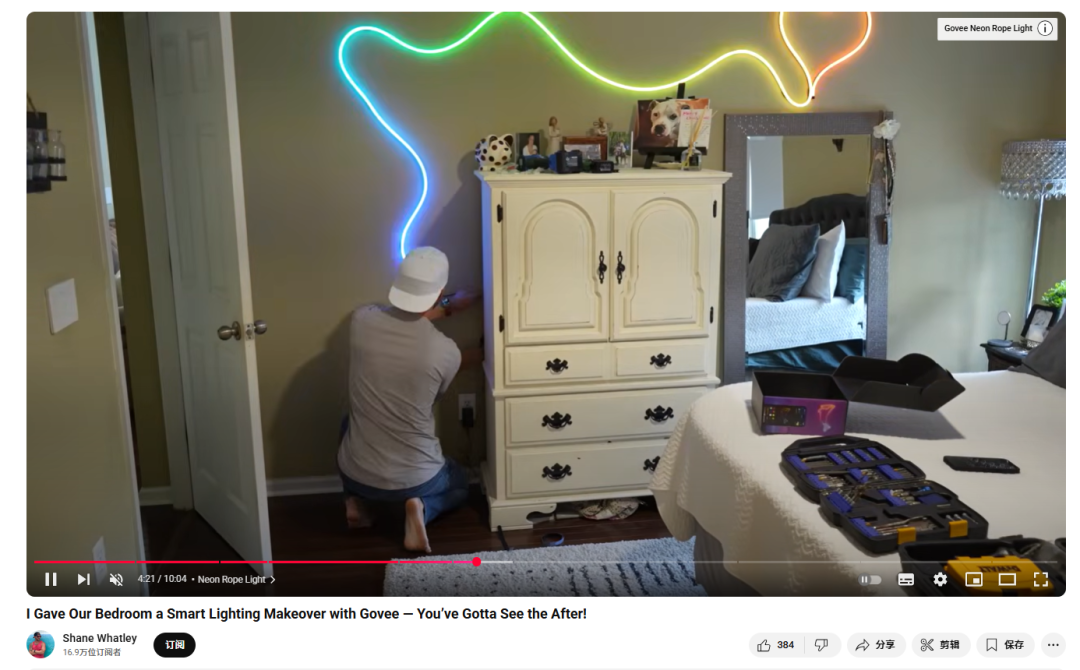 此外,博主@Shane Whatley在其发布的视频《I Gave Our Bedroom a Smart Lighting Makeover with Govee - You've Gotta See the After!》中,从“卧室照明难题”切入,逐步介绍了Govee智能照明的多款产品:床头台灯、支持AI同步的电视背光灯箱、营造氛围的壁灯、炫酷的霓虹绳灯、床底灯光展示、柔和的COB漫射灯带,甚至还有智能灯泡。