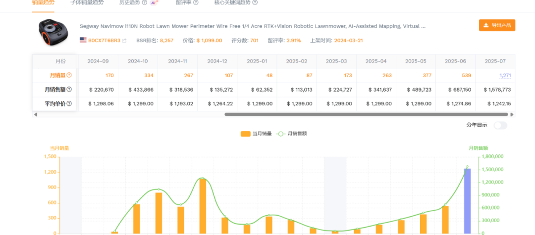 这款产品一经发布,便迅速登上亚马逊智能割草机畅销榜榜第一,仅在最近 30 天内,其销售额就已突破 157 万美元。