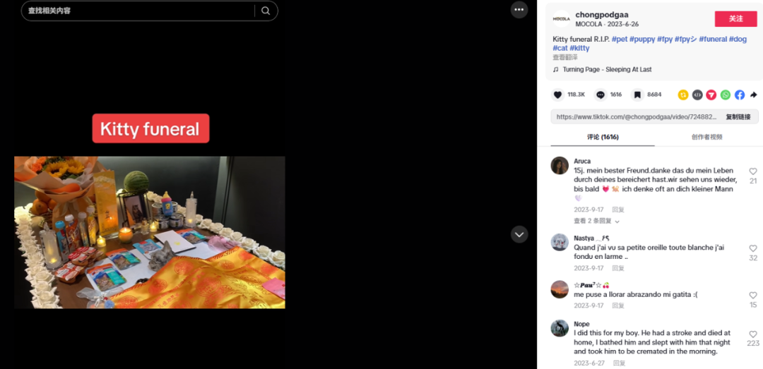 TikTok 上,#petfuneral 标签下的视频数量超 1000 条,其中最高播放量的视频突破百万。