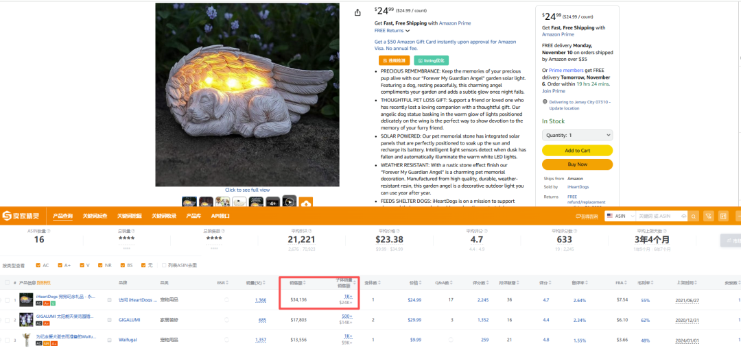 其中,一款会发光的宠物纪念石最受欢迎,近 30 天销量 1000+,销售额达 3.4 万美元。