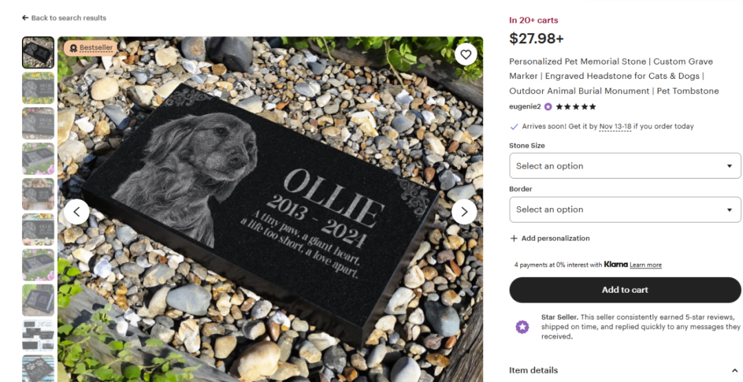 其中,销量最为突出的是一款“个性化宠物纪念石”。该产品专为缅怀不同种类的宠物设计,支持根据宠物特征进行定制,不仅可刻写任意长度的文字,还能镶嵌宠物照片。