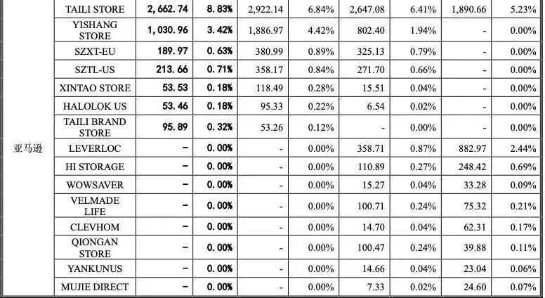 其在亚马逊的各个店铺,以及店铺销售金额如下,其中“LEVERLOC”等多家没有销售额的,是其旗下店铺公司基于构建品牌和产品矩阵战略而设立的第三方店铺,目前均已关闭。
