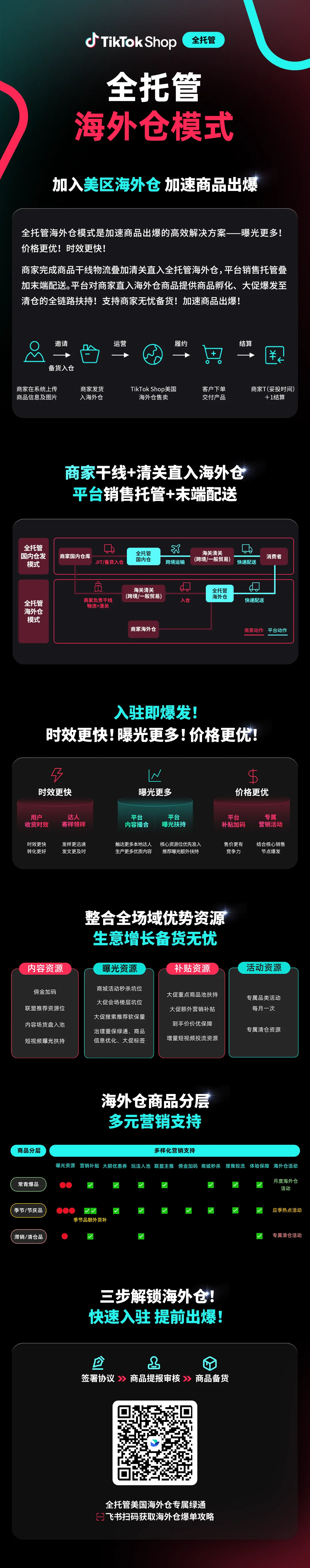 TikTok Shop全托管美区海外仓,打造高效履约路径,为商家大促上新爆单保驾护航!常青爆品、季节/节庆品、滞销/清仓品这三大入仓商品,可享九大营销曝光资源,更有对应专属海外仓活动提供曝光支持!