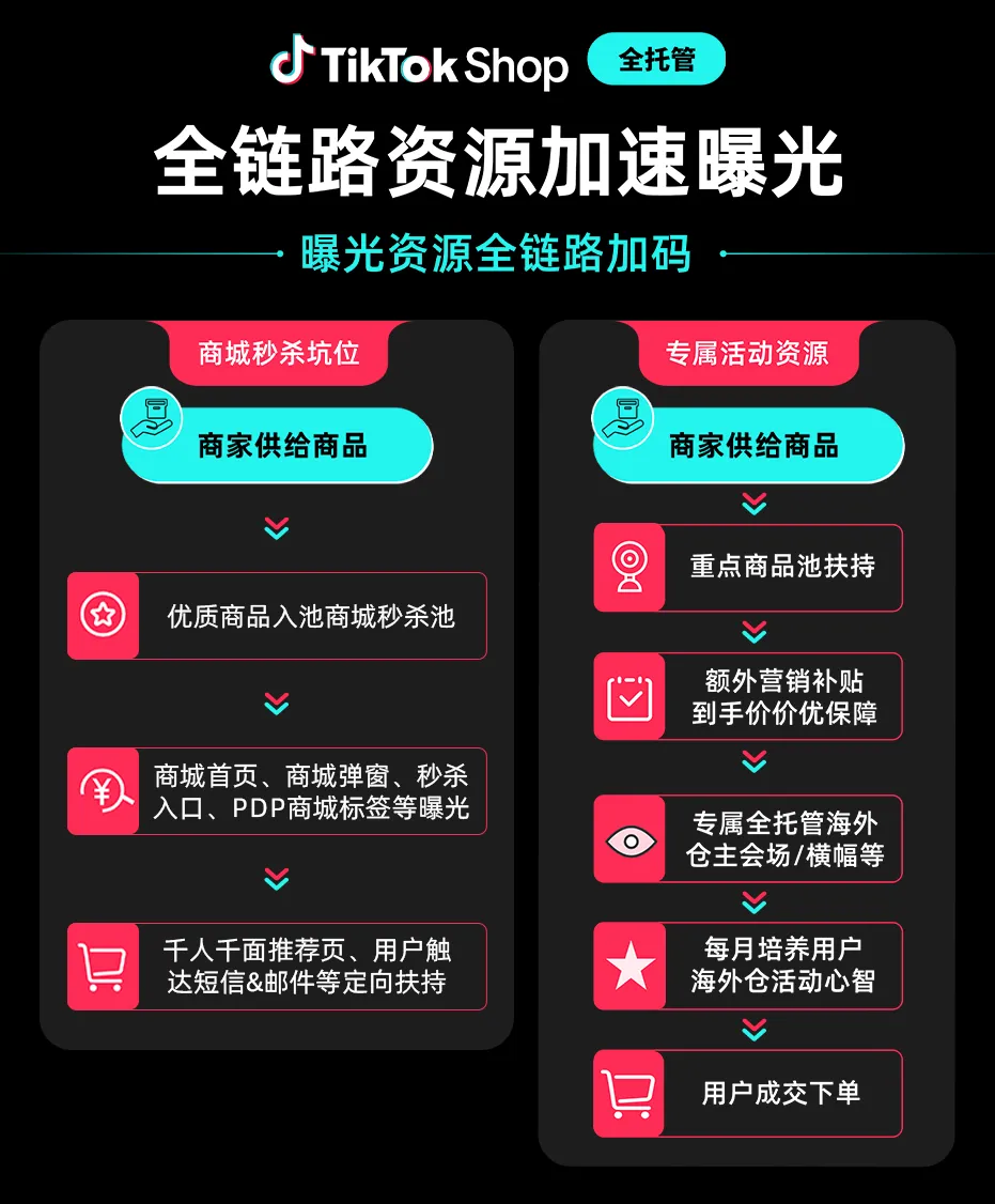 全托管海外仓更从商品供给、场景曝光到用户心智培养,全方位提升商家商品的曝光量与转化效率,更有海外仓商品的专属运营支持,帮助商家在TikTok Shop平台实现高效增长。