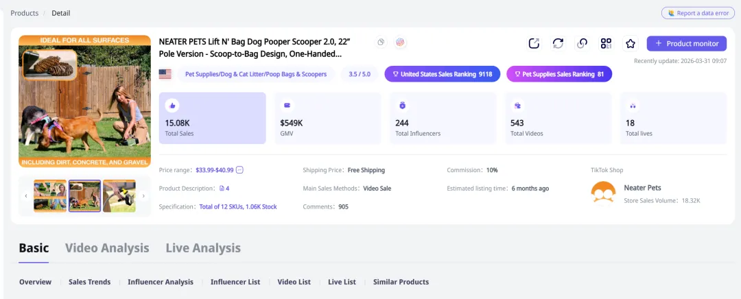 根据 EchoTik 数据分析,这款来自小店NEATER PETS 的宠物拾便器,曾杀入 TikTok 美区宠物用品大类热销榜 TOP 10。