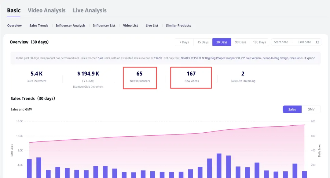 更夸张的是它的内容带货能力。近30天内,该产品联动了 65位 达人,发布了 167条 带货视频。