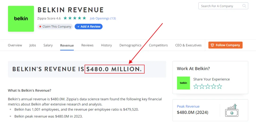 据美国职业服务平台 ZIPPIA 的数据显示,在 2023 年,Belkin 的年销售额就已经达到了 4.8 亿美金(折合人民币约 33.44 亿)。