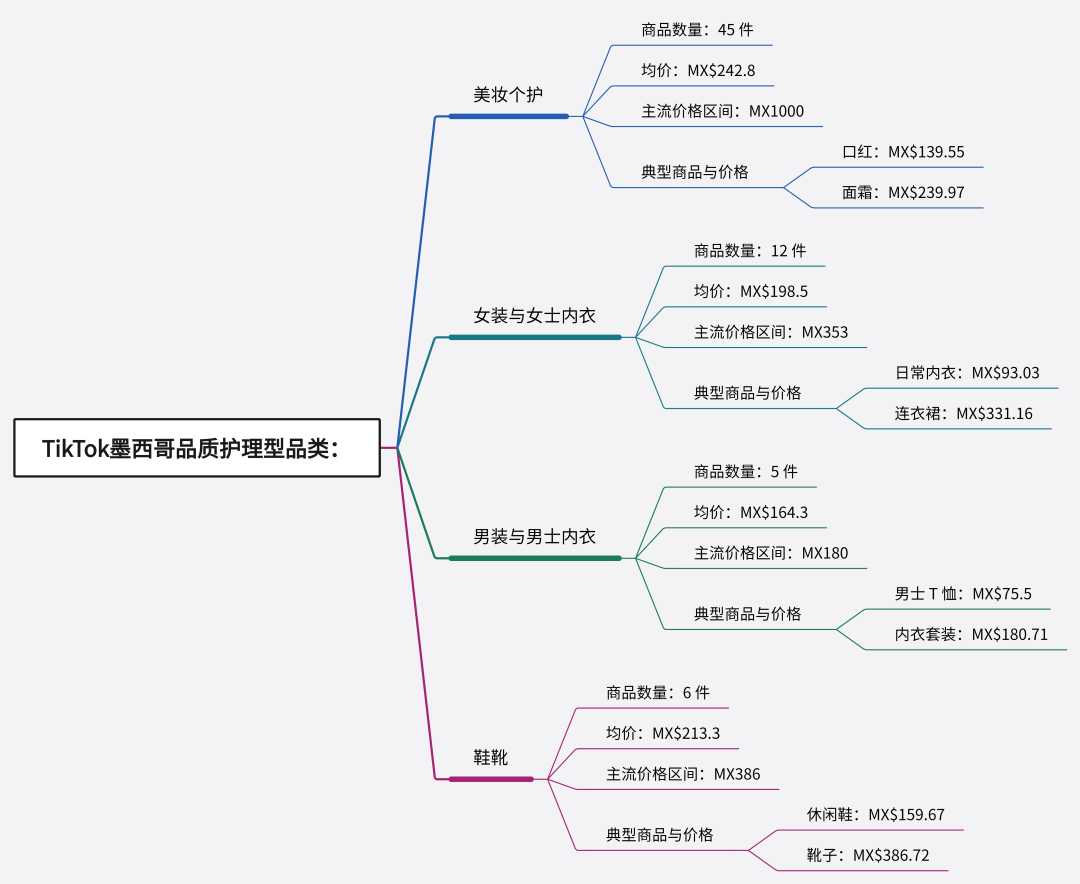 根据商品功能与消费需求,可将墨西哥市场核心品类划分为 “日常刚需型”“品质护理型”“专业功能型” 三类,各类别价格特征与运营逻辑差异明显: