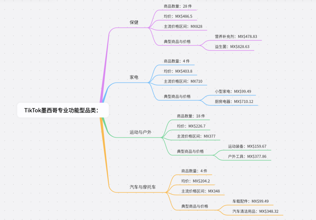 :价格区间从 MX$29.9(手机与数码类低价配件)到MX$1003.25(美妆个护高端产品),但80% 以上商品集中在 MX$100-MX$400 区间,均价约 MX$248,反映消费者对 “百元级” 商品接受度最高,过高或过低价格的商品受众均较窄。 高价商品特征
