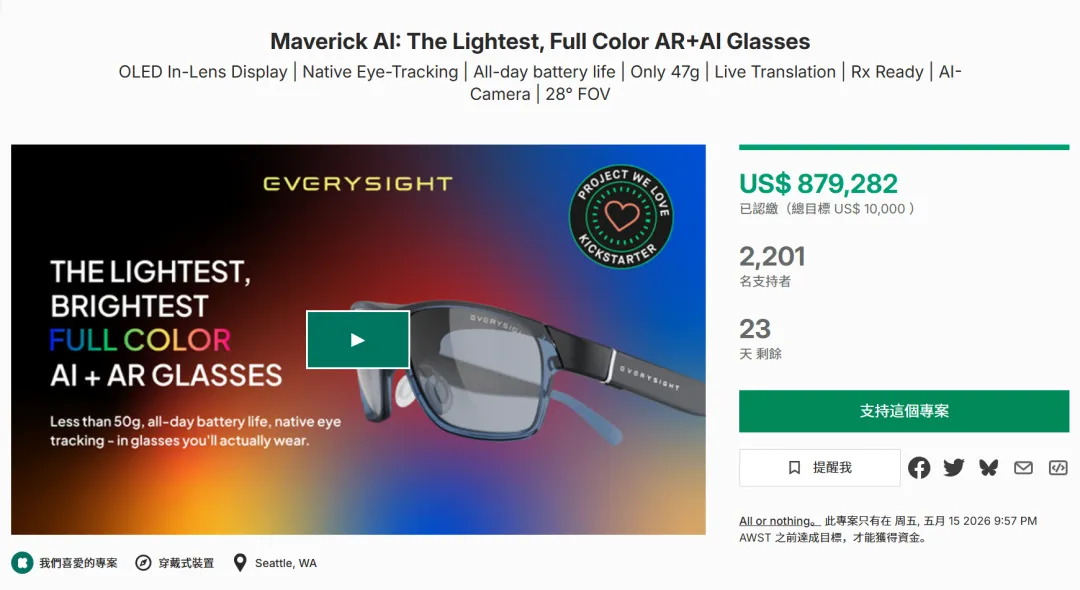 2026 年 3 月 31 日,Maverick AI 眼镜正式登陆 Kickstarter,项目周期 45 天,将于 5 月中旬结束。作为面向消费级市场的 AI 眼镜产品,它在上线初期便迅速完成融资目标,并持续放量。