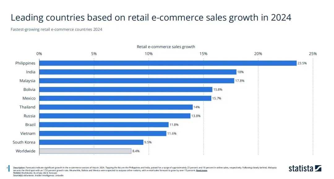 此外,Statista相关报告指出,马来西亚是2024年全球电子商务增长速度TOP3的国家,增长17.8%,仅次于增长23.5%的菲律宾及18%的印度。