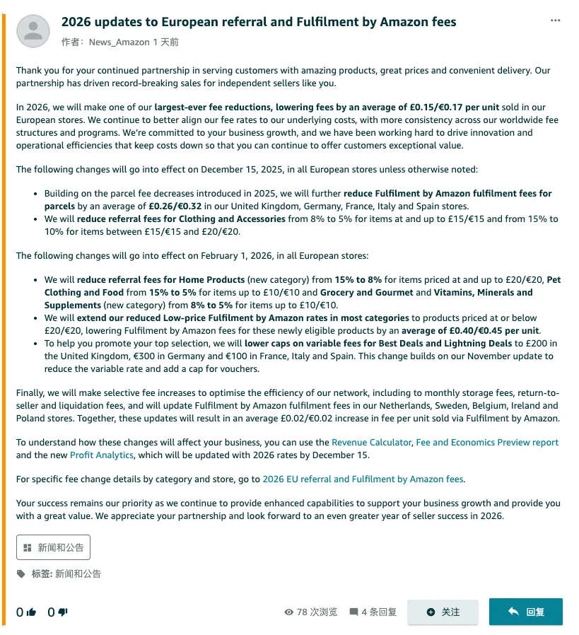 随着 2025 年接近尾声,亚马逊再次公布了针对欧洲和日本市场的费用调整计划。
