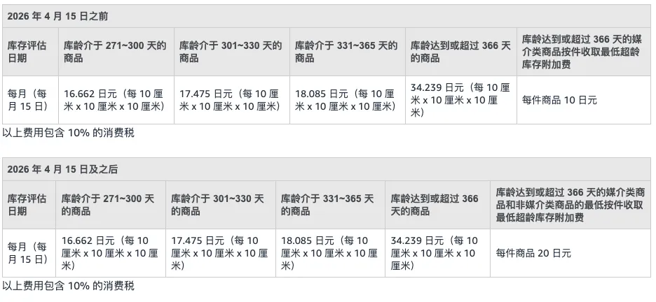 对于存放超过 12 个月的商品,每件每月将收取最低 20 日元的附加费。