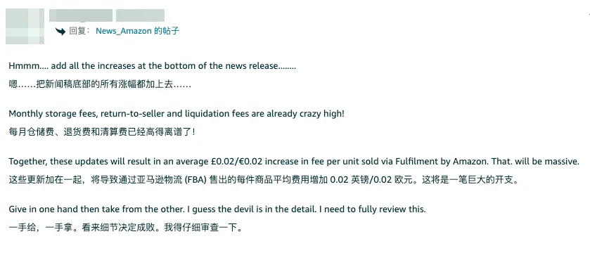 这些卖家指出,亚马逊的调整看似降低了部分费用,但其背后的结构调整,也意味着新的费用负担将取而代之。