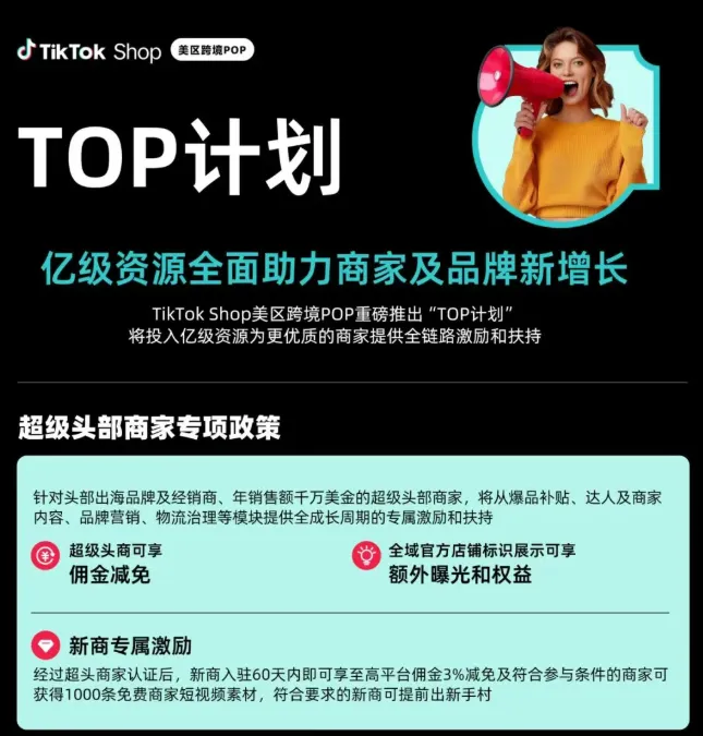 平台层面也发出了明确的信号。TikTok Shop 跨境电商副总裁木青表示,2026 年平台将持续加码专项激励与资源支持,助力有实力的超级头部商家充分释放增长潜能。TikTok Shop 美区跨境 POP 更是重磅推出了“TOP计划”,将投入亿级资源为更优质的商家提供全成长周期的激励和扶持,包括商品/商城扶持、内容经营扶持、平台营销激励、治理及物流保障等多个维度;并为头部出海品牌及经销商、年销售额千万美金的超级头部商家释放一系列专属资源与核心权益,如佣金减免、全域官方店铺标识展示。(政策适用时间范围为 2026 年 1 月 27 日至 3 月 31 日。)