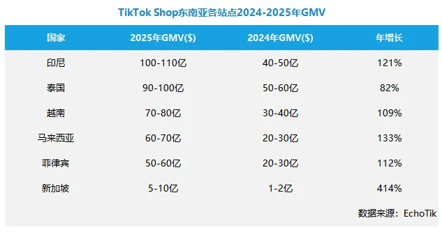 据 EchoTik 发布的数据,从区域拆解来看,印尼和泰国仍是东南亚 GMV 的最大贡献者,凭借庞大的用户基数与强直播转化能力,2025 年印尼 GMV 约 100-110 亿美元,年增长 121%,重新回到“老大哥”的位置;泰国紧跟其后,2025 年 GMV 约 90-100 亿美元,年增长 82%。