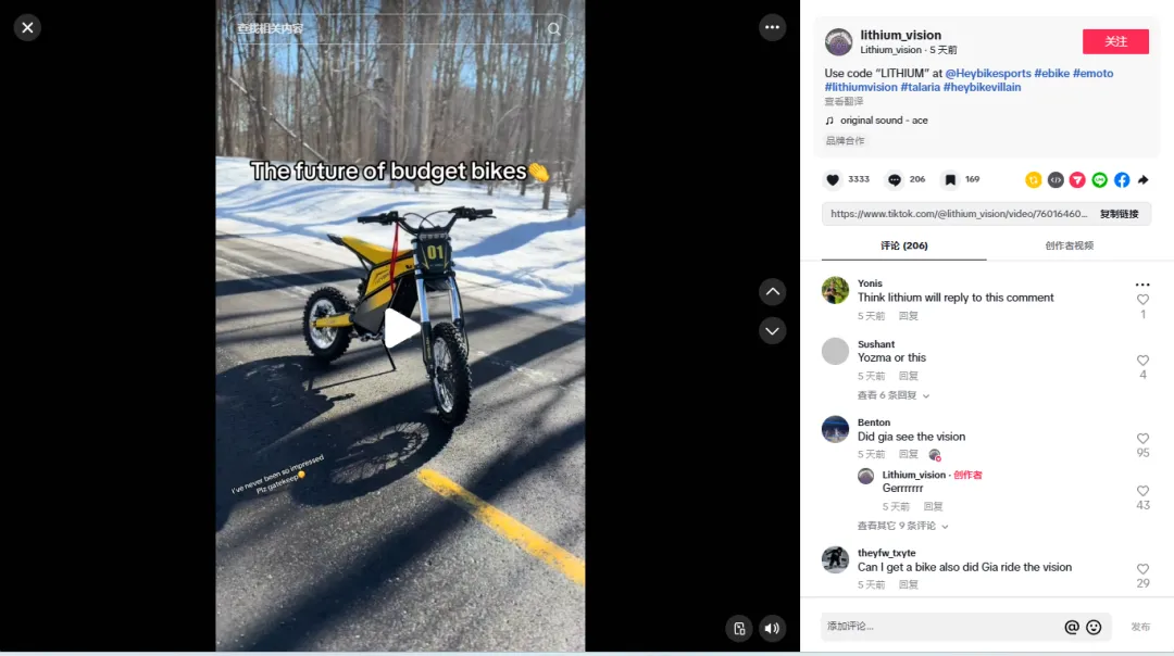 @Lithium_vision 是活跃于 TikTok 的电动两轮车测评博主,受众以 18–34 岁追求性价比的骑行爱好者、预算有限的越野玩家为主。视频以 “高性价比预算神车的未来” 为切口,全程实拍 HeyBike Villain 电动越野摩托的雪地骑行场景,弱化复杂参数讲解,突出车辆颜值、操控感与户外适配性,精准戳中预算党玩家 “想玩越野又不想花大价钱” 的核心痛点。视频获得 3333 赞与 206 条评论互动,评论区集中讨论车辆适配身高、速度表现、购买渠道等实际购买决策问题,具备明显的中后链路种草价值。