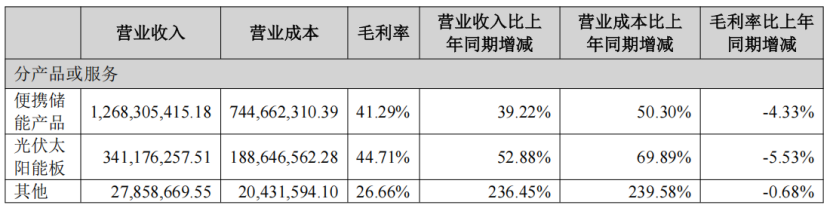 从主营业务收入概况来看,便携储能产品作为公司拳头业务,报告期内实现营业收入 12.68 亿元,同比增长 39.22%;光伏太阳能板业务增长更为迅猛,本期实现收入 3.41 亿元,同比大幅增长 52.88%。