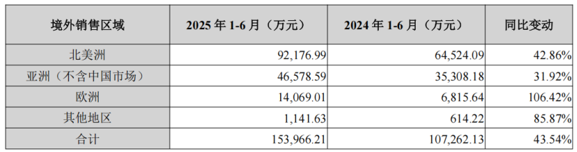 北美洲作为成熟核心市场,上半年营收达 9.22 亿元,同比增长 42.86%;亚洲(不含中国市场)营收 4.66 亿元,同比增长 31.92%;欧洲市场营收 1.41 亿元,同比激增 106.42%。